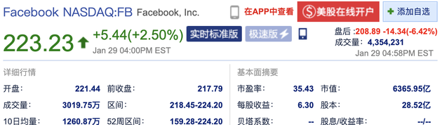 新浪科技讯 1月30日凌晨消息,Facebook周三收盘涨逾2%报223.23美元,市值达6365.95亿美元。