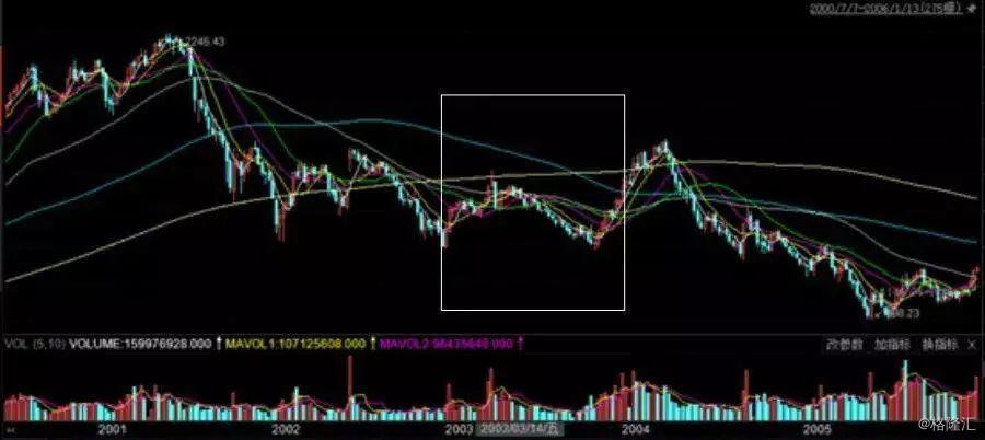 2003年A股走势的大背景是从2001到2005年的四年大熊市,四年间,沪指从2245点跌到998点,这一段下跌的特点是每年春天都有一波春季“吃饭行情”,市场各方资金抛弃分歧,合力打出一年的利润,然后“各回各家,各找各妈”,股指一路阴跌创新低。