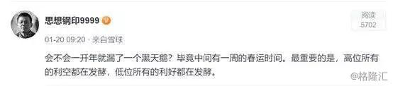这是指中央即将出台的一系列政策,疫情几乎肯定对上半年的经济产生冲击,国家也一定会有对冲政策,但2020年不是2003年,政策的结果谁也无法预测,到底要放多少水,哪些行业会获得当年的房地产那样的政策,房地产这个尿壶会不会再用一次?这才是决定2020年走势的最重要的因素。