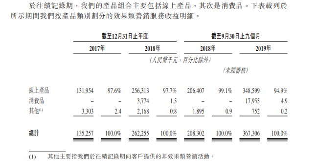 该公司的主要收入来自线上产品业务。于2017年、2018年及截至2019年9月30日止九个月,乐享互动录得收益1.35亿元、2.62亿元及3.67亿元,毛利为4541.1万元、6606.5万元及9147.9万元,而其中线上产品业务占收益比例分别为97.6%、97.7%及94.9%。