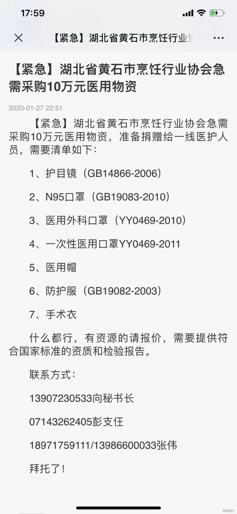 N95口罩、防护服这种医用物资不达标,很可能造成医护人员感染。我们现在正在找有检验报告和符合国家标准的靠谱厂商,但还没找到合适的渠道和厂商。