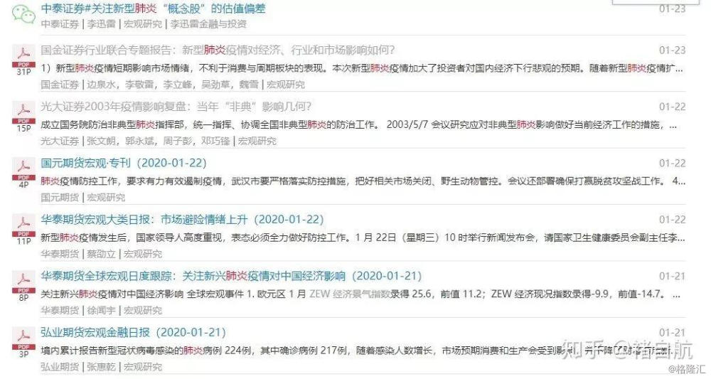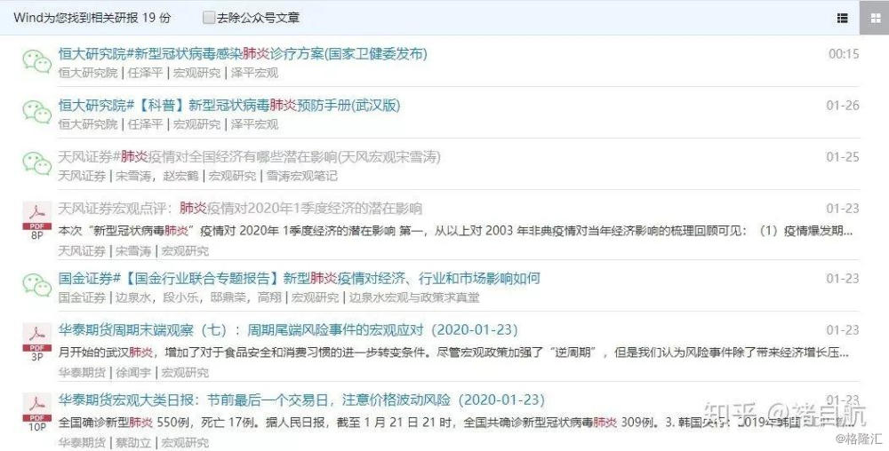 从宏观角度出发,我觉得可以参考下专业研究员的报告。1月27日下午1点33分我在wind研报平台上设置了肺炎,宏观研究,三月内三个关键词进行搜索,共搜到相关研报及文章19份。