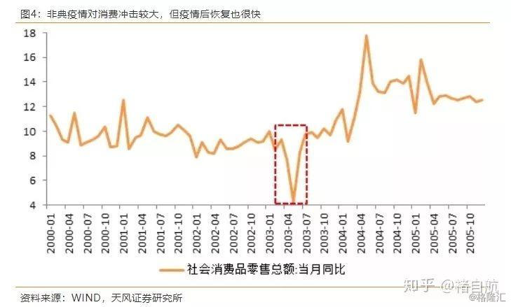 社零增速在2003年4-5月(非典爆发期)出现明显下滑,7月控制期结束后恢复增长势头。