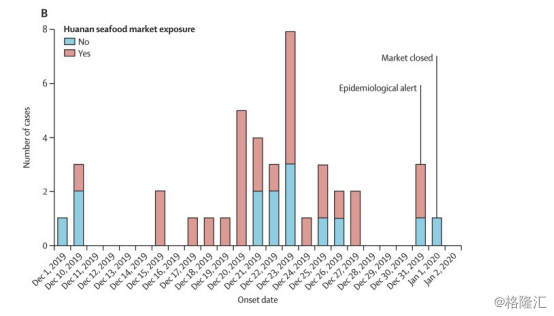 (首批41例确诊患者:蓝色为没有接触过海鲜市场,红色为接触过)