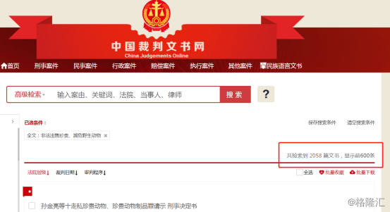 而在中国裁判文书网用“非法出售珍贵、濒危野生动物”为关键词,能搜出2000多篇文书。