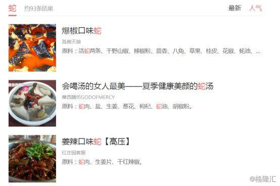 且不说全国那些大大小小的野味馆,就是在某一个面向大众的家常菜谱网站,都能搜出来十几道关于蛇的菜谱。