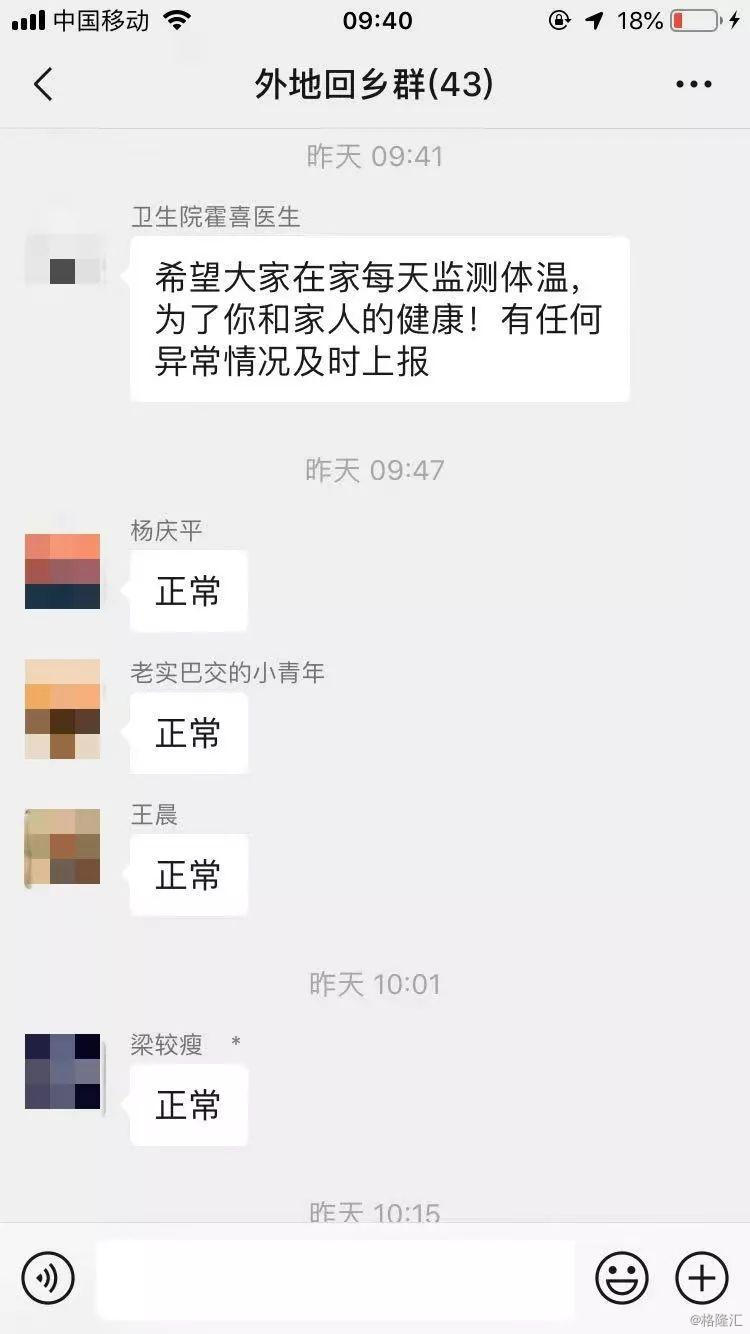 “村里面建了一个群,把我们从武汉回来的人拉了进去,每天都有提醒不要串门,还要上报体温。”刘梅对猎云网说道,村里面对他们还很重视,会给他们打电话了解情况,但问到具体隐私的部分,刘梅表示不太能接受,“连我在武汉住哪里,在哪个公司工作都得查。”