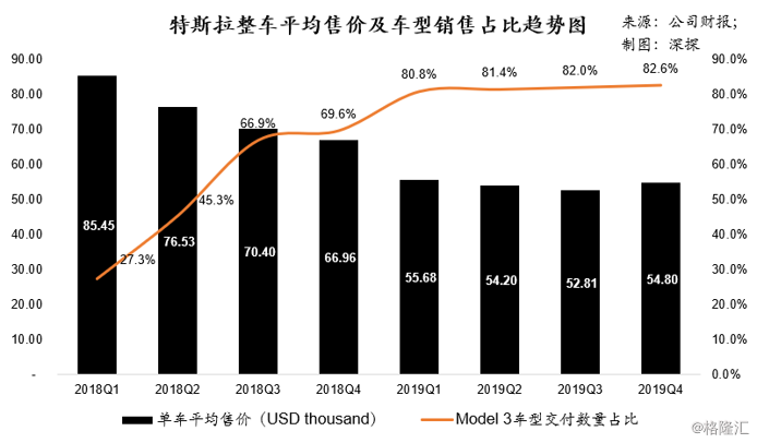 本季度,特斯拉交付的Model 3车型占全部交付车型比例为82.6%,占比进一步提升;而其平均价格则维持在54000美元上下,相对平稳。