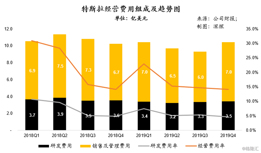 在费用上,特斯拉四季度研发费用为3.5亿美元,处于平稳状态,这主要是因为公司在产品已经进入相对成熟的放量阶段,其研发费用可以稳定相对可控的状态。随着未来收入的进一步提升,研发费用比例将持续降低。公司本季度整体经营费用率为14.1%,为历史新低,这也说明特斯拉整体的规模效应显现。