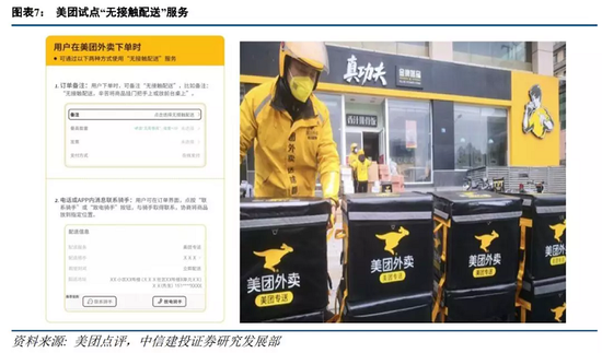 我们注意到此次疫情对于美团外卖配送既是挑战,同时也是一次推进其配送场景优化的窗口期。现阶段美团鲜明的提出‘无接触配送’服务概念,对于普通消费者通过备注不接触配送偏好方式进行,而针对医院等集体客户端则开始尝试设置取餐柜。截至1月27日,‘无接触配送’已在全国184个城市上线,很快将覆盖全国大部分城市。