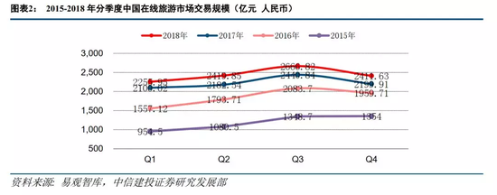 本次疫情始于2019年12月,但在初期并未引起社会恐慌心理,真正开始全面对社会产生实际影响是在2020年1月中下旬。接连出台的省际城际交通禁行、假期延长政策,与疫情相关的新闻实时推送、负责人发布会等措施对到店、酒旅消费者产生了心理屏障与实际的行动限制。根据多方预测,本次疫情或于3-6月份情况转好。因此我们认为今年上半年疫情将对到店酒旅业务产生持续的负面影响。另一方面,根据易观智库2015-2018年数据,我国在线旅游市场的交易规模基本呈现出下半年大于上半年的特征,因此疫情对于上半年交易的负面影响也存在一定的限度。