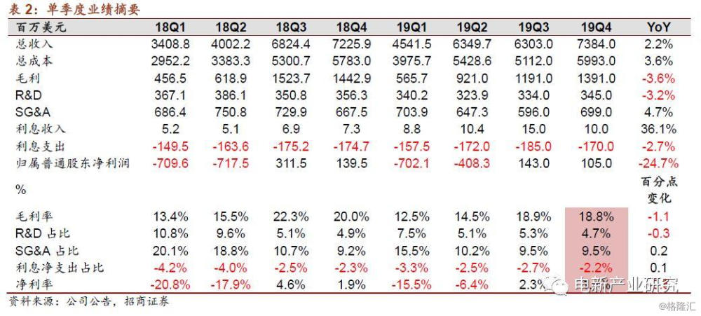 19Q4公司营收约73.8亿美元,同比增长2.2%,环比增长17.2%,超出市场预期,主要系19Q4公司整体销量同比增长23%。