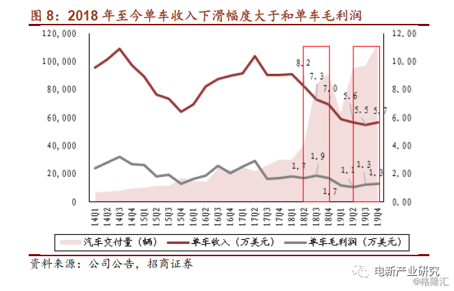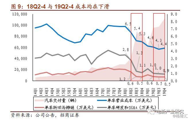 在2019Q2-Q3,公司单位研发和SG&A维持在1万美元左右,单车折旧与摊销也有小幅下滑,整体看维持较强的费用管控能力,并且仍在摊薄固定成本。不过Q3的盈利更多源于单车营业成本中其他成本较大幅度的下滑,预计主要系电池等物料成本的扰动。根据Q4公司单车折旧与摊销基本稳定,但营业成本环比略有提升,也可印证。