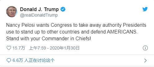 特朗普在推文中表示,“佩洛西希望国会剥夺总统用来抗衡其他国家并捍卫美国人的权力。与你们的总司令站在一起!”