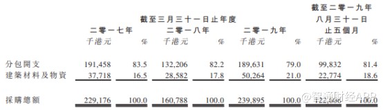 从具体的采购明细来看,分包商费用是公司主要的采购项目,2017—2019财年,公司分包开支虽然占采购总额的比重持续下降,但仍保持在80%左右。由于公司每次承接的工程量大小不同,同时香港劳工成本不断上涨,导致公司总体的分包成本不会有明显的下降,而这无疑将影响其整体的毛利水平。