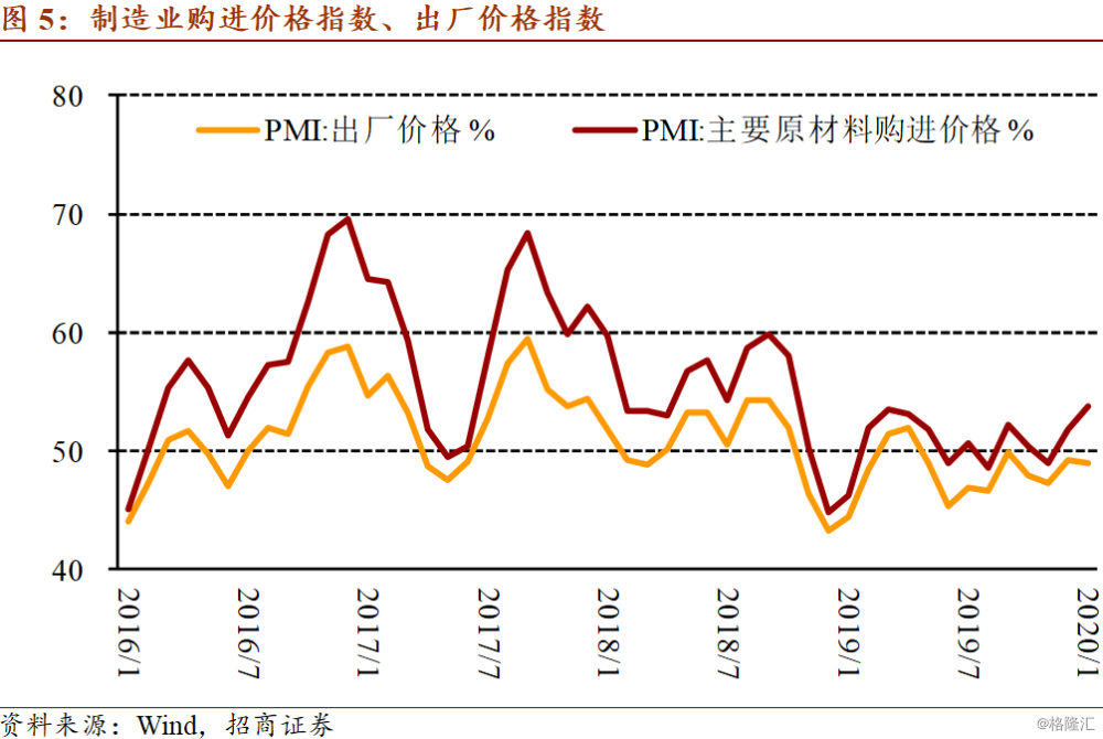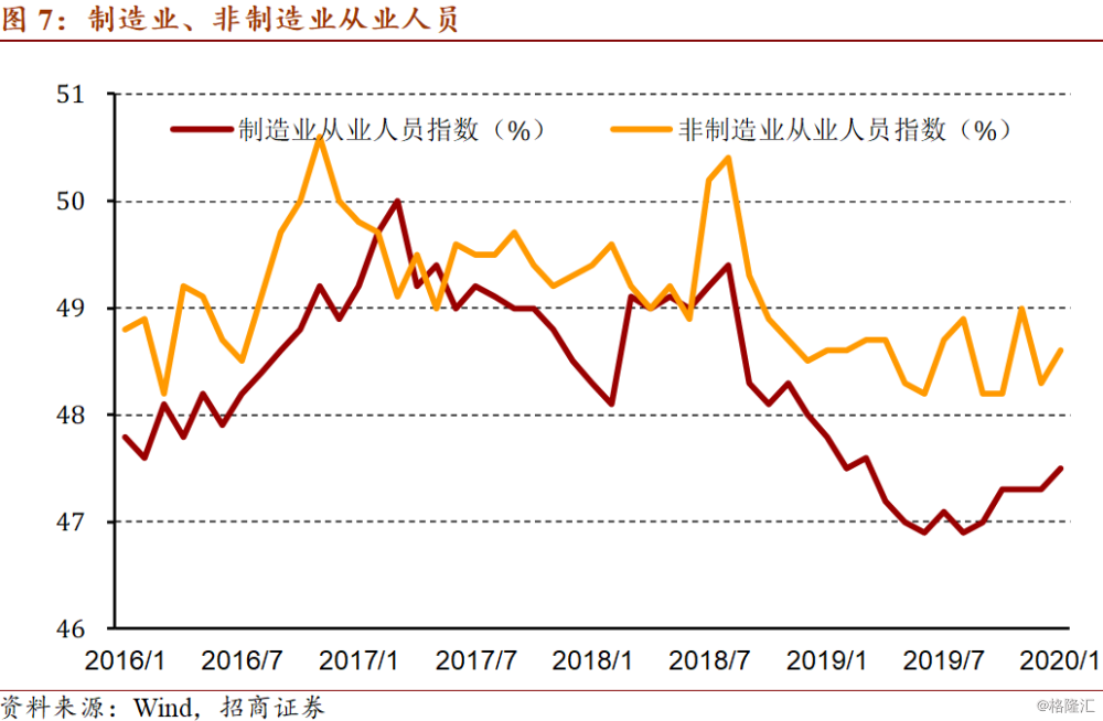 最后来看从业人员指数,2019年四季度以来制造业、非制造业从业人员指数都有见底回升迹象,特别是制造业从业,从业人员指数已从最低值(2019年8月的46.9%)逐步回升至47.5%,趋势向好。