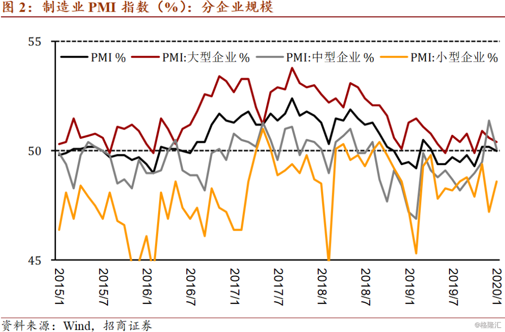 分企业规模来看,2020年1月大型企业指数回调至50.4%,前值50.6%;中型企业指数回调至50.1%,前值51.4%;小型企业指数修复至48.6%,前值47.2%。