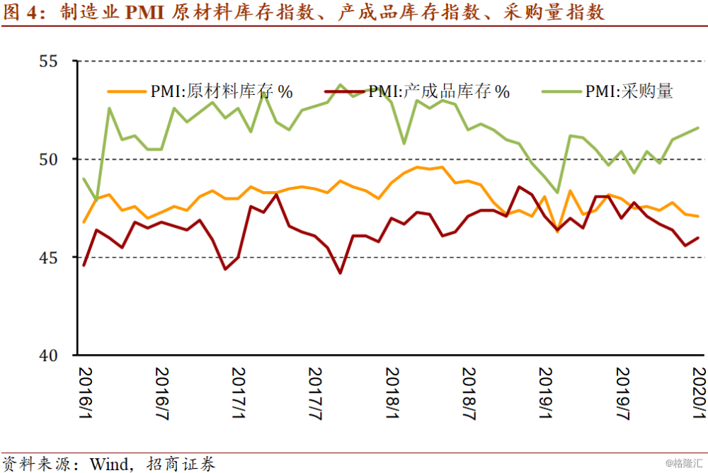 1月采购量指数继续上升,连续3个月在临界值以上加速。原材料库存指数仍在临界值以下探底,而产成品库出现见底回升迹象。