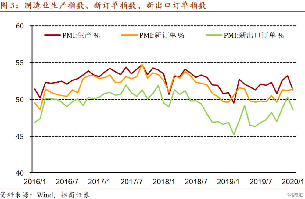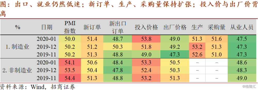 综上所述,1月中国PMI仍保持景气,分项指数中出口、就业仍然低迷;新订单、生产、采购量保持扩张;投入价与出厂价出现背离。尽管疫情冲击尚未充分体现,但中国制造业仍处于缓慢而持续的景气修复过程之中,预计仍将运行在50上下0.3个百分点以内。