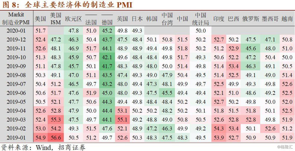 从全球范围来看,2019年12月以来出现更多改善信号。首先是美国、法国的Markit制造业PMI仍然保持在临界值以上;其次英国、德国、欧元区整体、日本等发达经济体进一步向临界值收敛;再次韩国、中国台湾再次回归临界值以上;最后新兴经济体之中,中国、印度、巴西、越南等仍然保持在50以上。