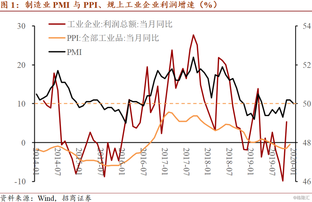 2019年11、12月,中国制造业PMI连续录得50.2%,显示出景气趋于修复;同时PPI同比增速11月以来连续收窄降幅且即将转正;对应11月以来工业企业利润增速也出现明显修复。