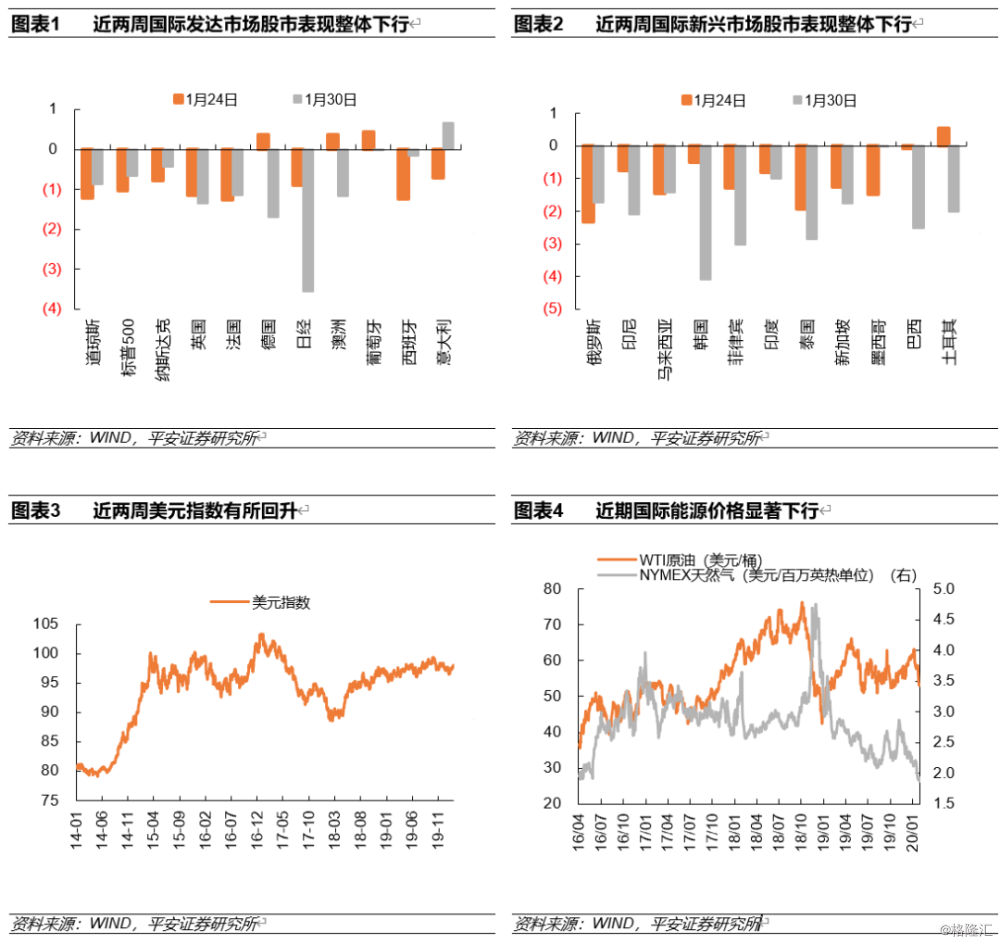 在春节前后的这段时期,国际市场受到新型冠状病毒引发疫情的冲击,风险资产整体迎来调整,而避险资产则获得阶段性的回升。具体来看,无论是发达市场股市,还是新兴市场股市,均在这段时期表现弱势,其中处于东亚、东南亚地区的日本、韩国、菲律宾、泰国股市下行幅度明显高于其他市场,这既与其距离中国大陆较近,且出现病例数目多于欧美等其他经济体有关,也是其与中国大陆的经贸关联度更为紧密的结果。各国债市则在避险情绪回升的带动下表现较好,国债收益率整体出现下行。汇市方面,美元指数、日元受避险情绪推动有所回升,而欧元、人民币相对美元则有所回落。大宗方面,原油、天然气等能源价格与国际金属价格均显著回落,而黄金价格则表现强势。预计在春节假期结束后,国内市场短期也将呈现风险资产弱势、避险资产回升的格局;但随着疫情或在2月出现向下的拐点,国内与国际市场的风险资产或将迎来触底回升,避险资产则会在高位震荡后出现回落。