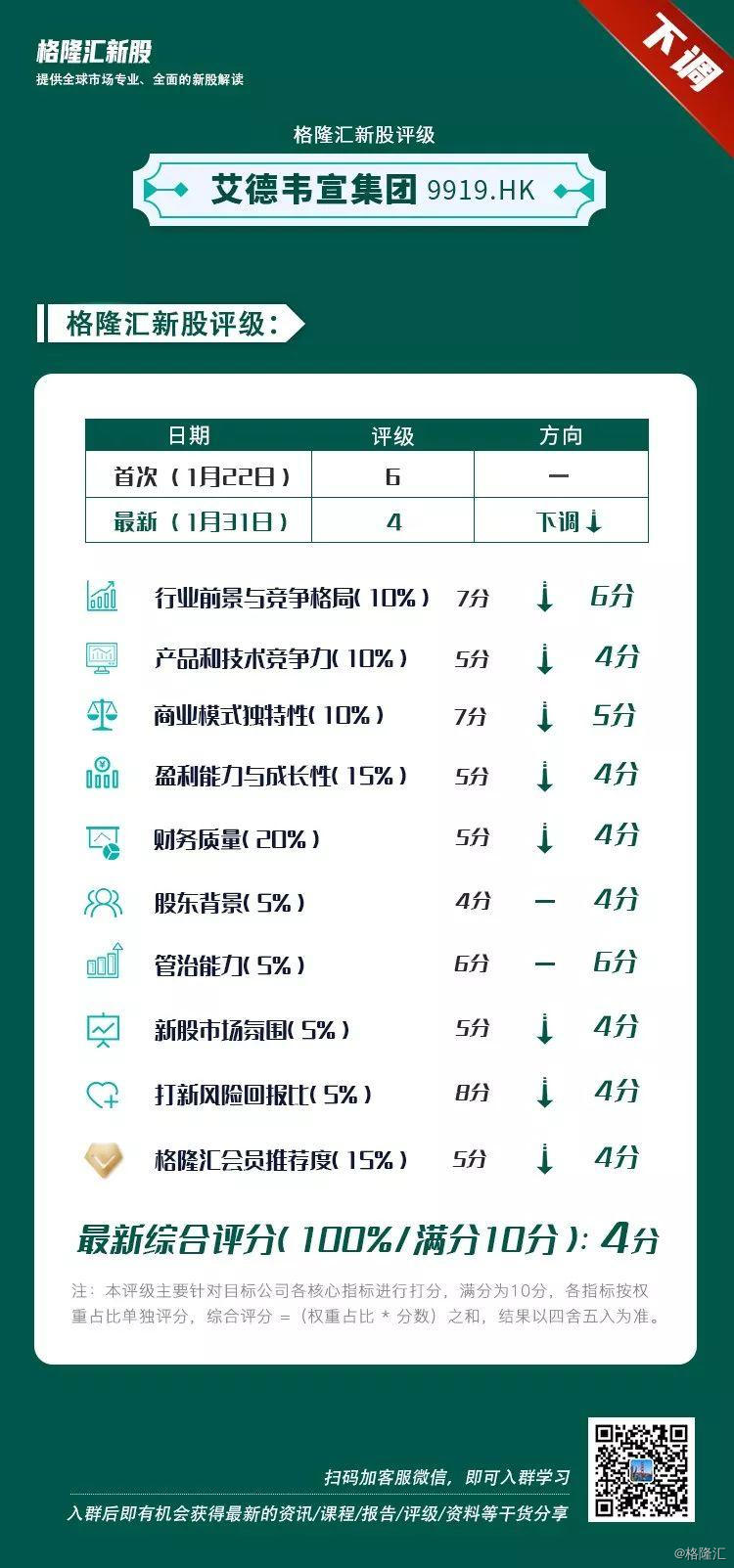 格隆汇新股研究根据已公开数据及独家的内部评级体系,给予艾德韦宣(9919.HK)的新股综合评估的最新分数为4(满分为10分),前次首次评分为6,方向为下调。如下图: