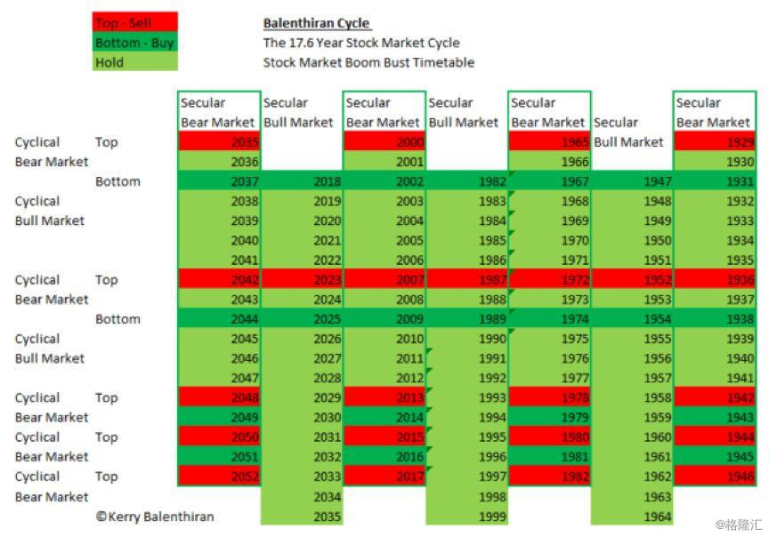 笔者自己的独立研究也确认了17.6年这个数字。后来,当笔者接触到凯辛和威廉姆斯的观点时,几乎觉得难以置信——三个人在各自互不知情的情况下,各自独立分析,最终的结果都指向了这样一个明确的周期长度。不过,我又做了进一步的研究,发现17.6年的周期,其增量单位是2.2年,这与1929年、1987年、2000年和2007年等股市重大转折点完全吻合。于是,笔者不揣冒昧,将这称作是巴兰西朗周期(Balenthiran Cycle)。