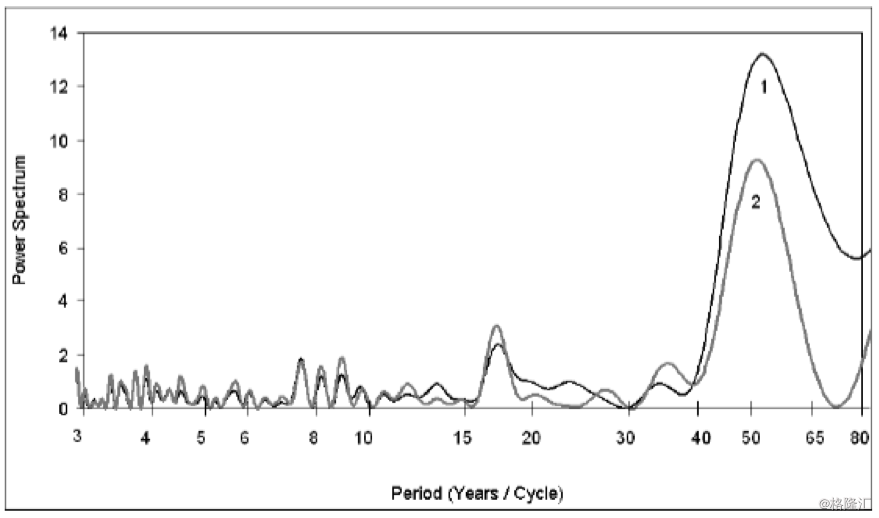 “……笔者并没有合理的证据去假定一个Jugular周期当中所覆盖的Kitchin周期,或者是Kondratieff 周期当中所覆盖的Jugular周期数量是恒常不变的。然而,根据我们的时间序列研究,确实可以得到一个这样的大致结论。根据历史记录和统计数据,除了极少数特殊情况,完全可以通过计算得出,六个Juglar的长度等于一个Kondratieff,三个Kitchin又等于一个Juglar——不是平均数据,而是每一个个案都是如此。”