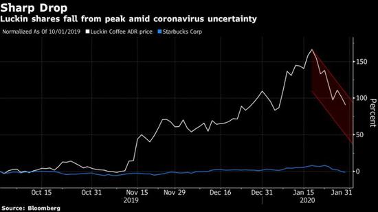 北京时间2月1日消息,自冠状病毒爆发以来,瑞幸咖啡(Luckin Coffee)的股价已跌去了近三分之一。
