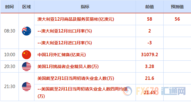 周四重要经济指标相对较少,投资者首先需要留意一下中国1月外汇储备的变化,可能会在短线轻微影响人民币汇率和澳元等商品货币的表现。