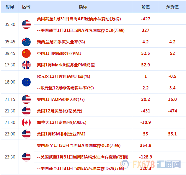 此外,投资者还需要留意美国1月ISM非制造业PMI的表现,目前市场预期将延续温和改善的趋势,也略微偏向利好美元的表现,可能会利空多数非美货币和金银的表现。