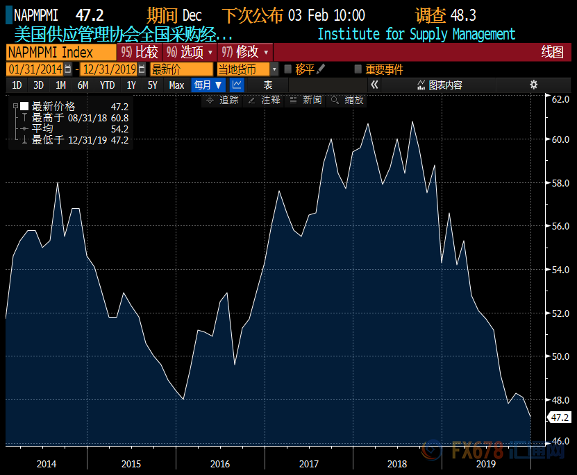 北京时间2020年1月3日23时,美国供应管理协会(ISM)公布的数据显示,美国2019年12月ISM制造业PMI为47.2,创下2009年6月(46.3)以来的最低水平,也是美国制造业连续第五个月出现收缩,且远低于路透社调查的经济学家预估值49。