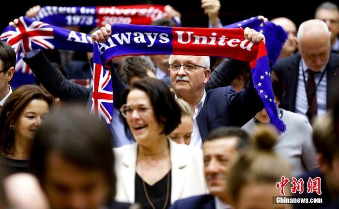 2020年1月29日,欧洲议会批准“脱欧”协议。投票结束后,在场议员高举“永远团结”旗帜。中新社发 欧盟供图