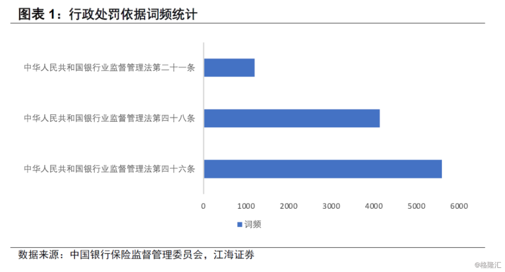 本文的数据来源于银保监会官网,数据时间跨度为2016年至2020年1月21日,所用数据为针对银行行政处罚的案由及依据,不包括与保险行业相关的行政处罚。首先,我们通过分析行政处罚依据每个词出现的频率,找到出现频率前三的常用词分别是《中华人民共和国银行业监督管理法》第四十六条、第四十八条、第二十一条。分析其主要内容,我们发现处罚原因主要有如下几个:严重违反审慎经营规则(包括风险管理、内部控制、资本充足率、资产质量、损失准备金、风险集中、关联交易、资产流动性等内容)。