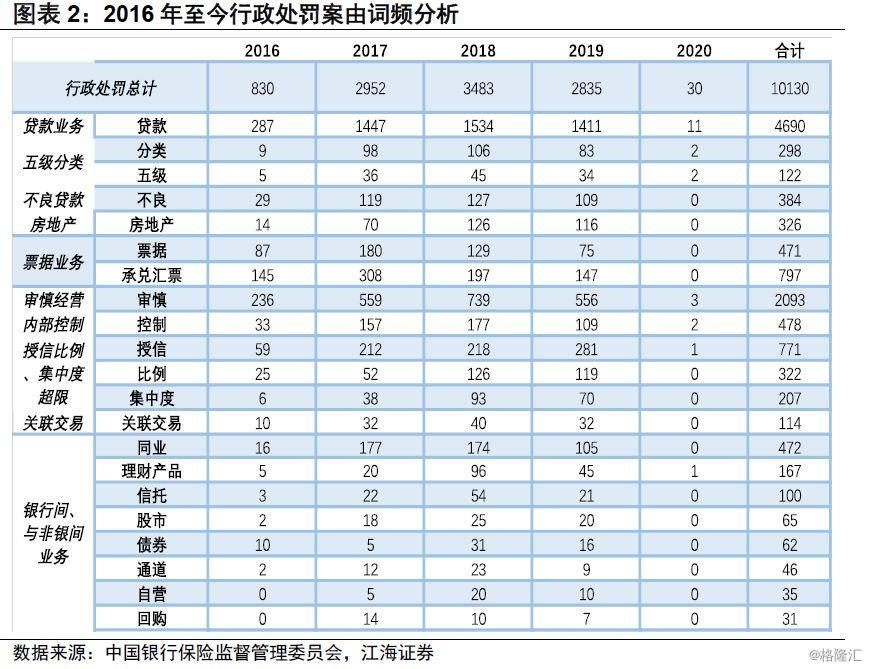 随后,我们将通过行政处罚的案由交叉验证所观察到内容。从每年行政处罚的数量来看,我们发现2016年行政处罚的力度较轻,2018年行政处罚的数量最多,这有可能与2018年资管新规出台之后,银保监会加强监管力度有关。2019年行政处罚数量又下降至与2017年相当的水平,可见监管在2019年边际放松。从2020年的数据来看,因为新年伊始,同时又临近春节,目前所公布的处罚文件数量偏低,根据天数进行线性外推是毫无意义的,想要判断2020年整体的监管力度仍需看后续情况如何。