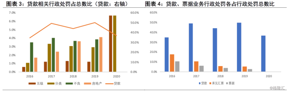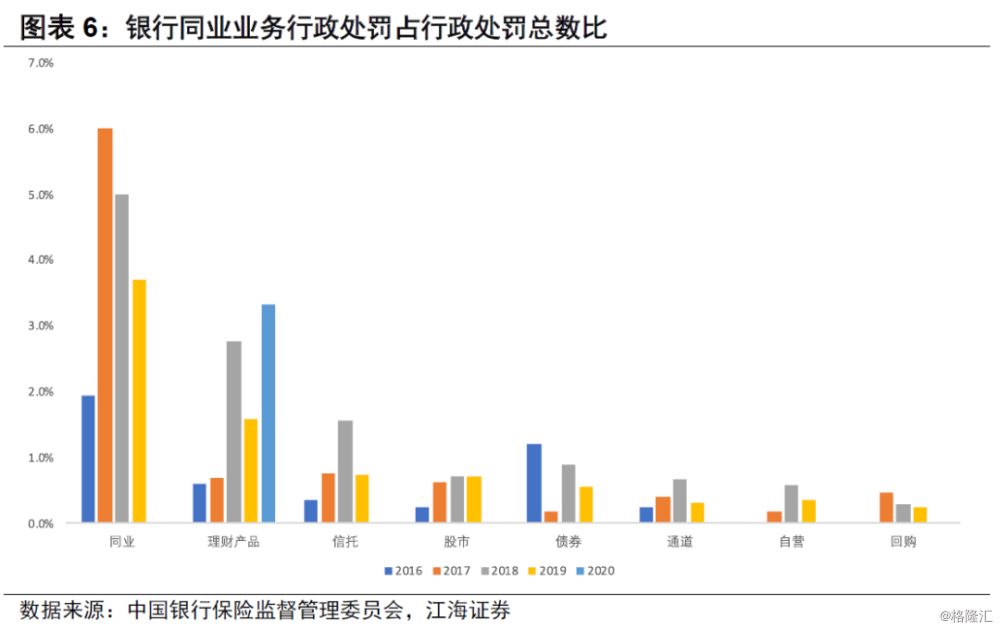 至于银行的其他业务,我们重点关注银行间以及与非银相关的一些业务。因此我们统计了同业、理财产品、信托、通道、自营、回购、债券、股市等几个关键词。总体来看,银保监会对于同业业务的监管,要早于银行与非银间业务的监管。银保监会对于银行同业业务的监管,从行政处罚数量来看,2017年监管力度最强,2018年以后呈现边际放松的态势。对于理财(2020年仅有一单与理财相关)、信托、股票、债券的监管在2018年达到峰值。具体来看,同业业务是银保监会重要的处罚对象,处罚理由主要有以下两个:存放同业融出资金超比例、违规通过同业发放异地贷款。由此可见,一是银保监会要求中小银行经营属地化之后,对于异地贷款的监管较为严格;二银保监会对于银行同业业务的控制较为严格。
