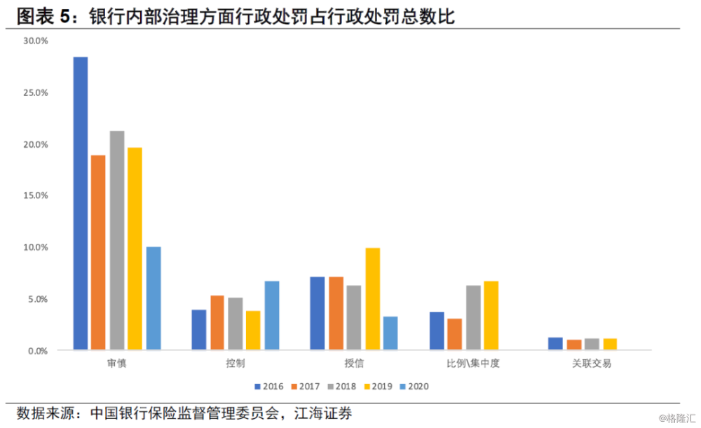 从银行内部治理的角度来看,审慎经营原则主要体现在风险管理、内部控制以及关联交易方面。从词频来看,授信、比例、集中度、关联交易四个关键词是最能体现监管对这个银行内部治理的要求,其中规范授信业务是近期监管的重点。授信方面,无论是在相对比例上还是在绝对值上,该词频2019年出现的频率都是2016年以来最高的。关联交易方面,银行对于关联交易的管理做得较为到位,因此因关联交易而受处罚的比例常年处于低位, 维持在4%到5%左右。