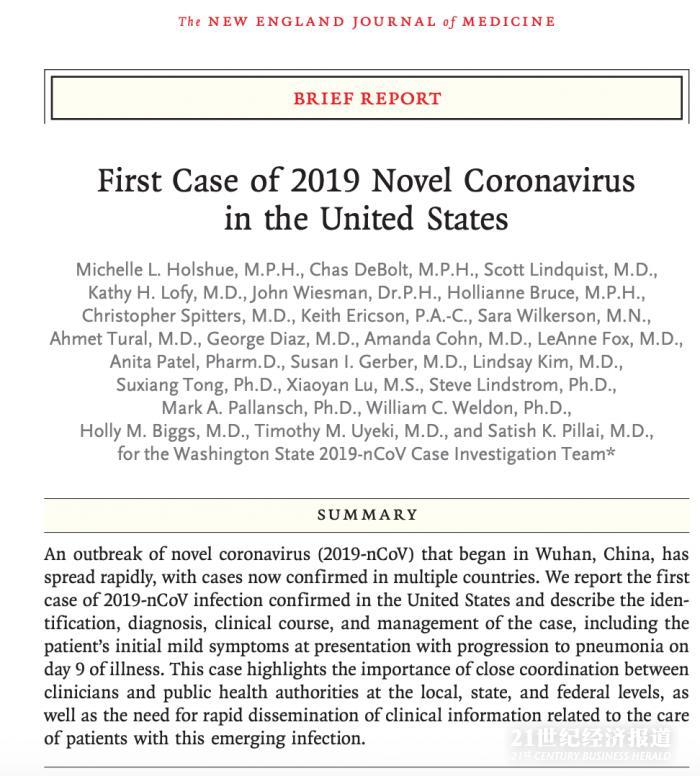 1月31日,顶尖医学期刊《新英格兰医学杂志》(NEJM)在线发表了一篇关于美国首例新型冠状病毒(2019-nCoV)确诊病例的论文,详细介绍了该患者就医、治疗以及临床表现。