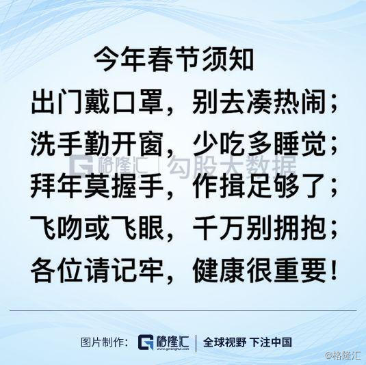 春节将至,对抗病毒的生命保卫战仍在轰轰烈烈,对比17年前,此次防疫无论从信息发布、防控救治、应急处理等都不可同日而语。我们此时该做的是响应号召,多团聚、少出门;多网购、少逛街;不信谣、不恐慌;多锻炼、多传播正能量。照顾好家人也照顾好自己。