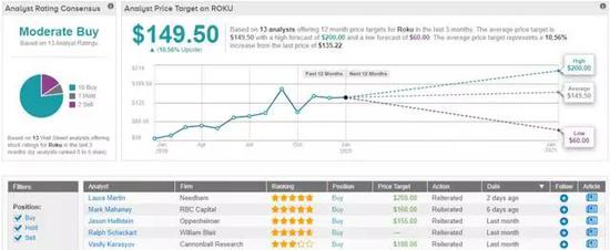 在华尔街上,Roku目前属于中度买入,其中包括10次买入、1次持有和2次卖出。分析师认为,Roku的平均目标价为149.50美元,因此该公司还有更多资金,可以在2020年将股价再提高12%。