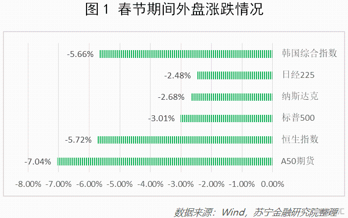 春节前最后一个交易日,A股在疫情发酵的影响下遭遇重挫,随后闭市进入春节假期,在此期间美股、港股等受冲击明显(见图1)。
