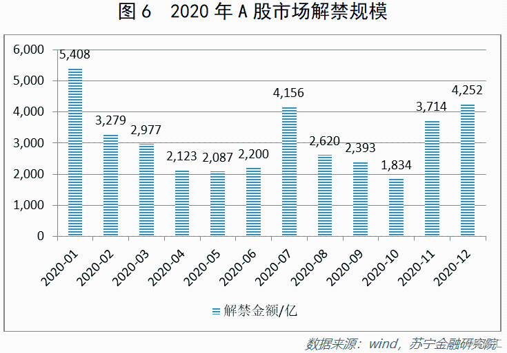 2020年是A股市场集中解禁期(见图6),一季度解禁总金额高达1.17万亿,按照2019年约为10%的冲击比例,一季度对A股市场的减持冲击金额将超1000亿;一月份解禁规模高达5408亿,会对A股市场产生一定的压力。