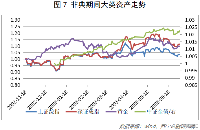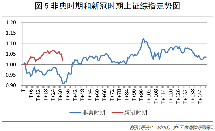 本次疫情的起因、发展、社会影响等与2003年非典有很多相似之处,对资本市场的影响也可借鉴(见图5)。非典时期,因初期没有受到足够的重视,资本市场的恐慌情绪并未蔓延,在阶段性回调后出现了春季躁动行情,上证综指一季度上涨了11%,并在疫情进入全面爆发前达到最高点;在疫情严峻时期,上证综指出现了显著地回调,累计下跌7%。