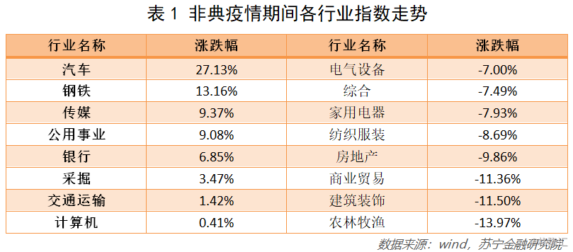 回顾2003年非典疫情期间各行业指数走势(见表1),涨幅居前的行业为汽车、钢铁、传媒、公用事业等,跌幅居前的行业为农林牧渔、建筑装饰、商业贸易、房地产等,结构性的投资机会明显。纵观涨幅靠前的行业,能看到2003年中国主要依靠投资拉动经济增长的影子。