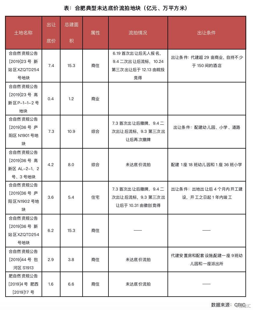 2019年春节后,二线城市土地迅速升温,合肥表现尤为突出,甚至引发调控政策一度升级,政府多次发布土地政策,分别从土拍规则、供应量等方面调控:调低滨湖区土拍最高限价,调整土地拍卖方式,起拍地价设定参考周边房价。全年来看,合肥政策稳中有收,因城施政地响应中央“房住不炒”准则。但根据CRIC监测数据,合肥等城市流拍率均超20%,依然成为流拍的“重灾区”,究其原因,主要是因为房企资金紧张、加之市场下行,在双重压力下,品牌房企对高要求配建用地有较大抗性,加之8月土拍新政出台加之年末房企融资收紧,土地市场降温明显,多宗土地未达底价而流拍。