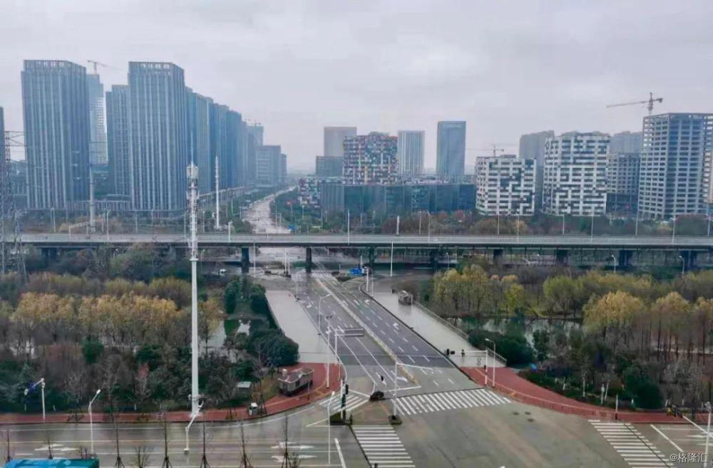 沈浩在家里阳台拍摄的武汉城区,南三环道路上空无一人一车 来源:受访者供图