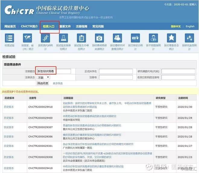 以「新型冠状病毒」为关键词在中国临床试验注册中心中检索发现,目前已经登记启动了7项研究,在武汉、广州、重庆、北京等4地开展,试验药物涉及中药、血必净注射液、糖皮质激素、利巴韦林+干扰素α-1b、洛匹那韦/利托那韦+干扰素-α2b等。