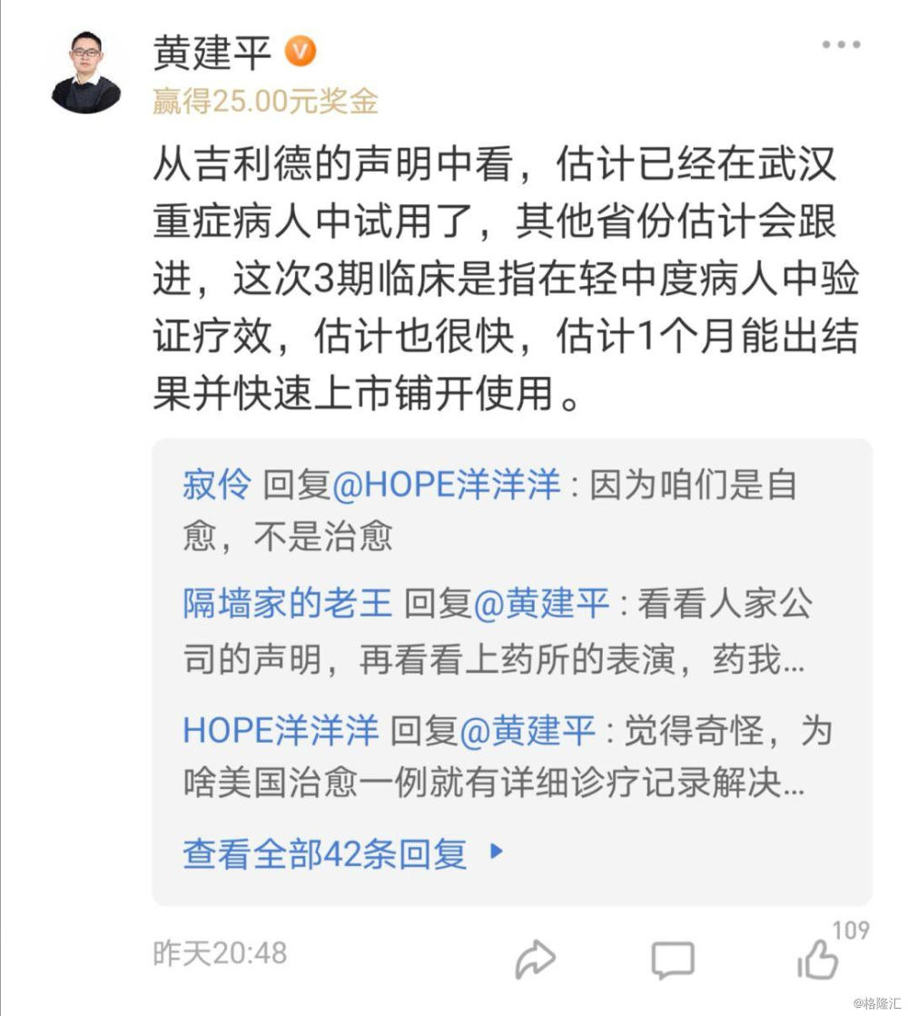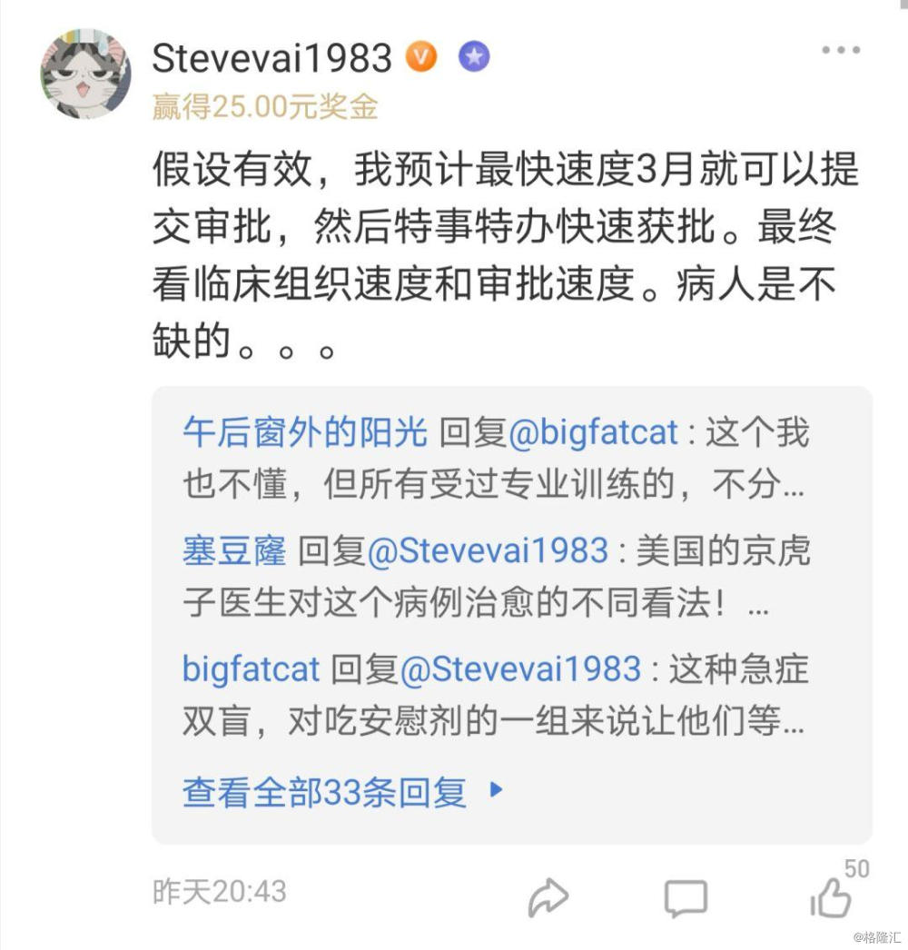 雪球用户@黄建平 @Stevevai1983 均表示,如果验证疗效,可能特效药上市并不需要等很久。