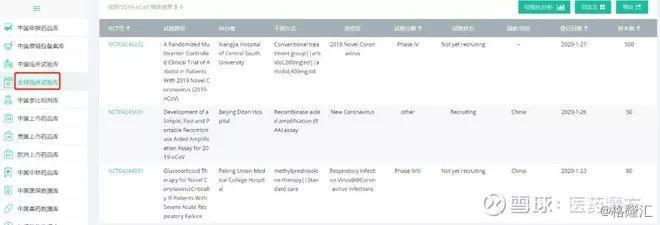 以「2019-nCoV」为关键词在医药魔方PharmaGo全球临床试验库中检索发现,目前已经登记启动了3项研究。其中有2项是治疗性研究。一项是来自中南大学湘雅医院开展的阿比多尔治疗研究,一项是北京协和医院发起的甲泼尼龙的治疗研究。